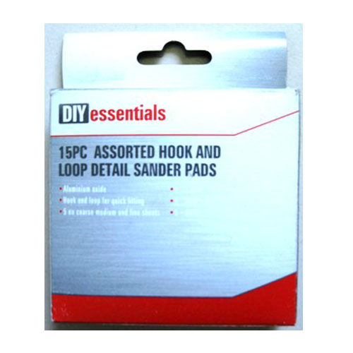 Item: Sand paper Packing: Color box Description: 15pcs assorted hook and loop detail sander pads, including 5pcs 120#, 5pcs 80#, 5pcs 60#, Material: aluminium oxide, hook and loop for quick fitting, 5 ea coarse medium and fine sheets.